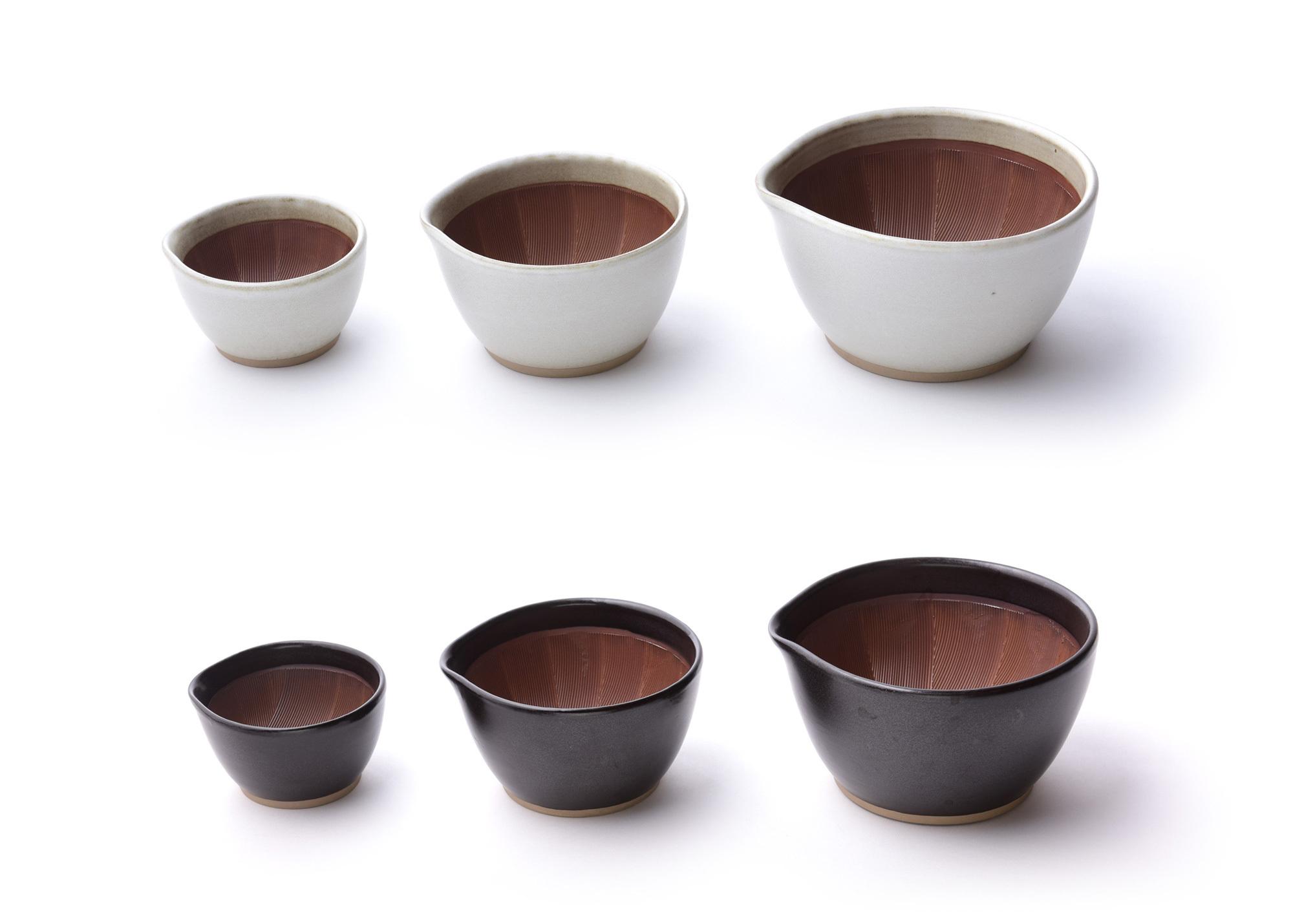 「もとしげ」のすり鉢は見た目がコロンとしてかわいらしく、食卓にそのまま器として出しても◎。深鉢なので、擦っていても食材が飛び出しにくく、かつ電子レンジ対応と使い勝手も抜群だ。もうひとつの定番、おろし器は驚くほど軽い力で簡単にすり下ろしでき、大根おろしが楽しくなると評判。すり鉢、おろし器ともに、裏面はシリコンゴムがついているため安定感は申し分なし。商品は周辺の道の駅のほか、工場でも直接購入できる。