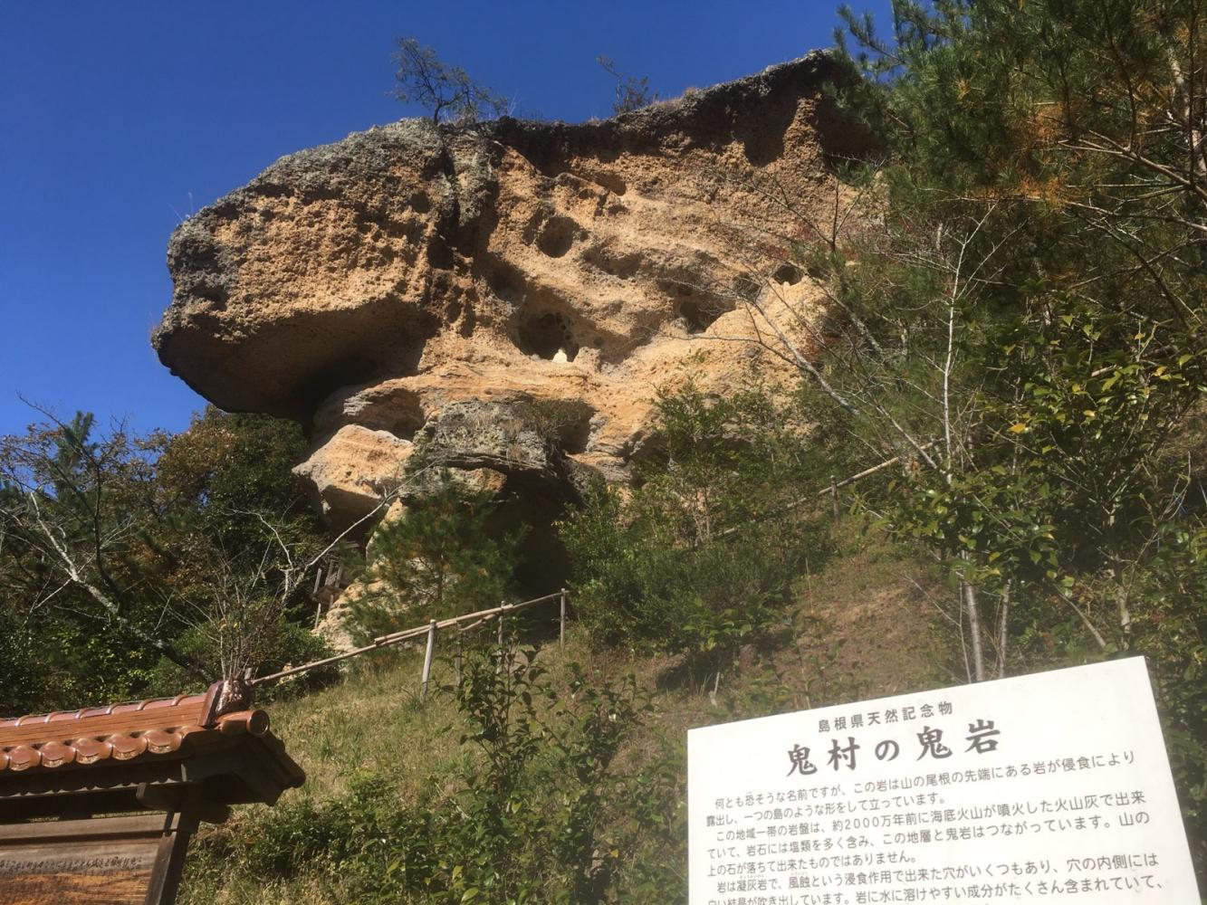 日本遺産にも認定された奇岩で、島根県の天然記念物。側面には5つの穴が並び、それらは鬼がつかんだ指の跡だという。太古の昔、海底火山の噴火でできた凝灰岩からなる鬼岩、岩に含まれる塩類の作用で風化が進み、現在の特徴的な岩を形成した。